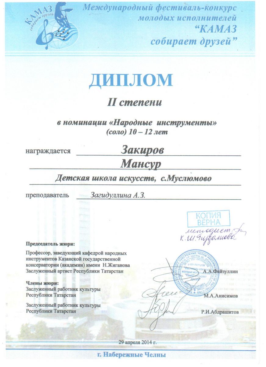 Закиров Мансур. Дипломант II степени международного фестиваль-конкурса "Камаз собирает друзей".