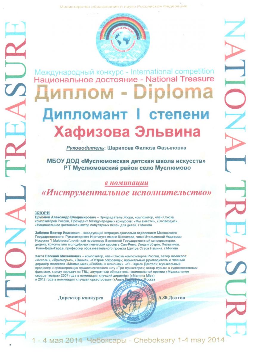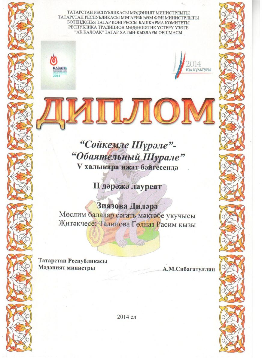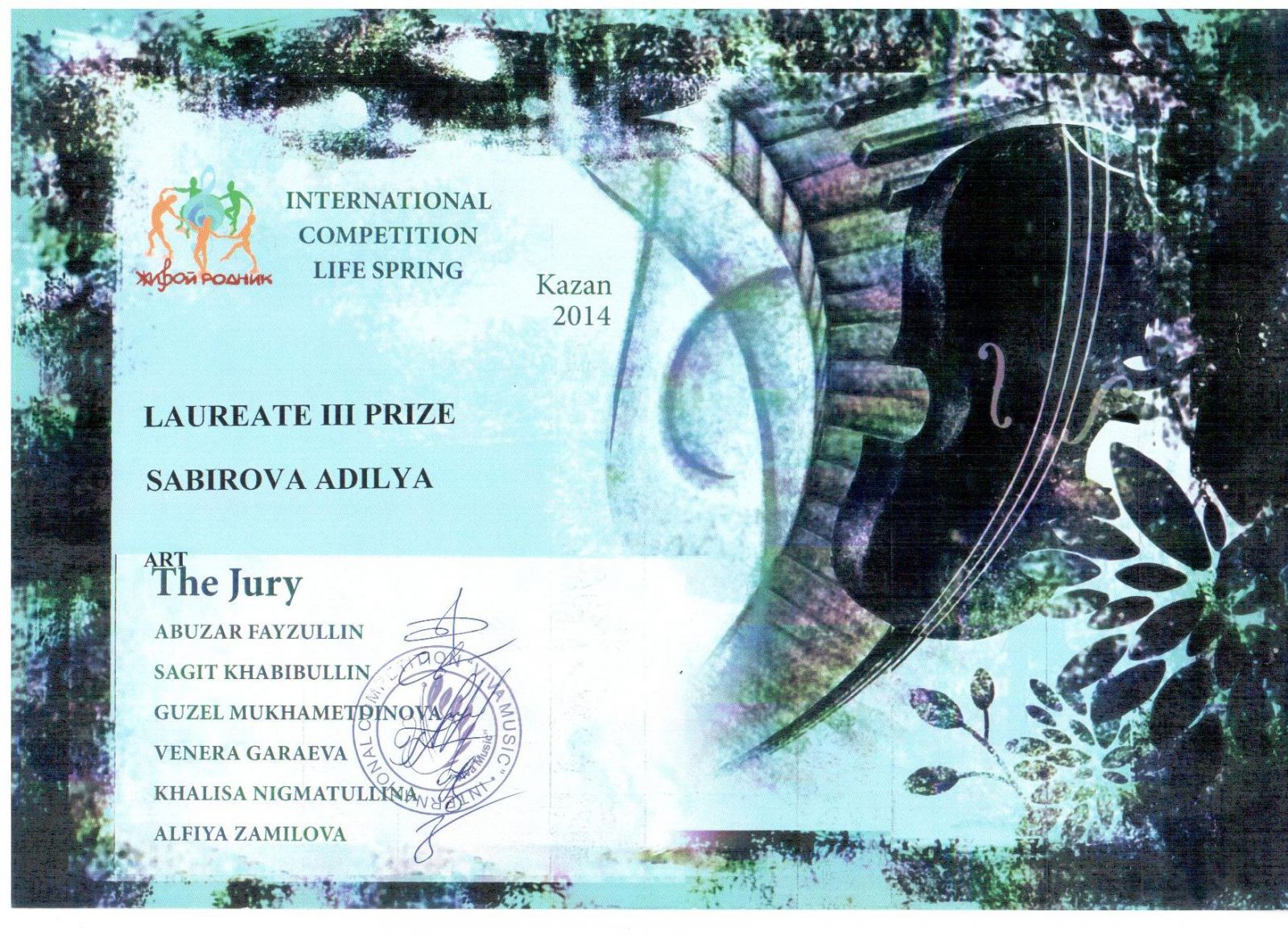 Хафизова Эльвина. Диплом V международного конкурс-фестиваля народного творчества «Живой Родник».