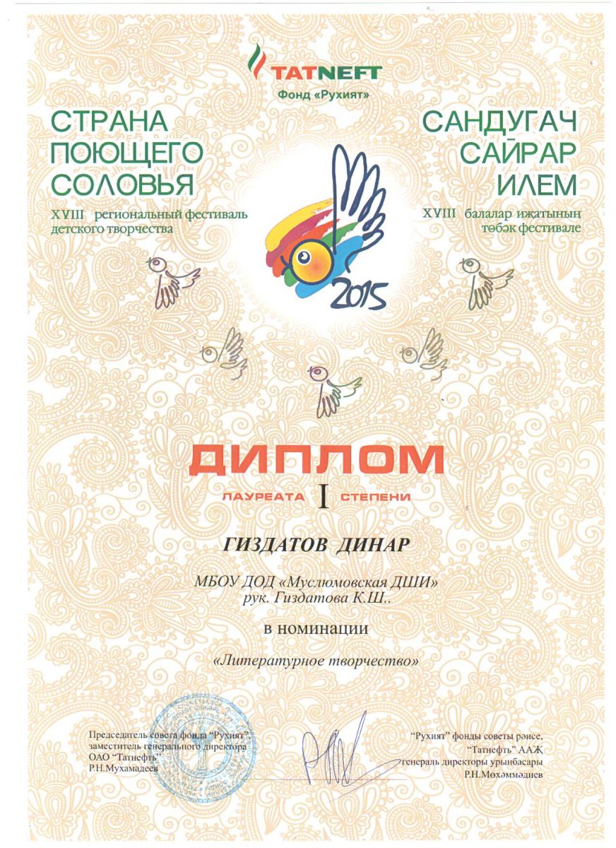 Каримов Закир. Диплом XVIII регионального фестиваля детского творчества "Страна поющего соловья".