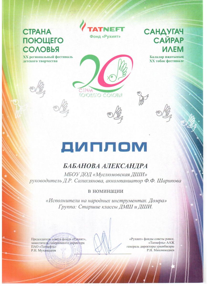 Бабанова Александра. Диплом XX регионального фестиваля детского творчества "Страна поющего соловья".