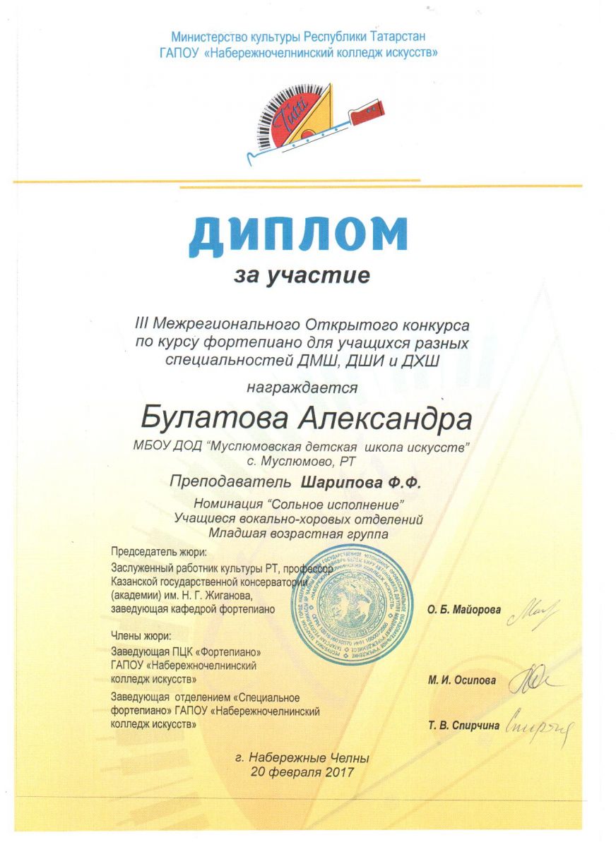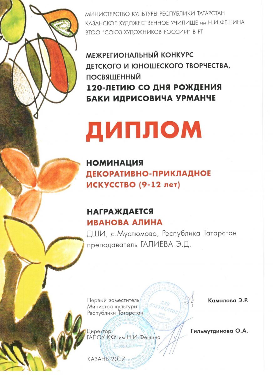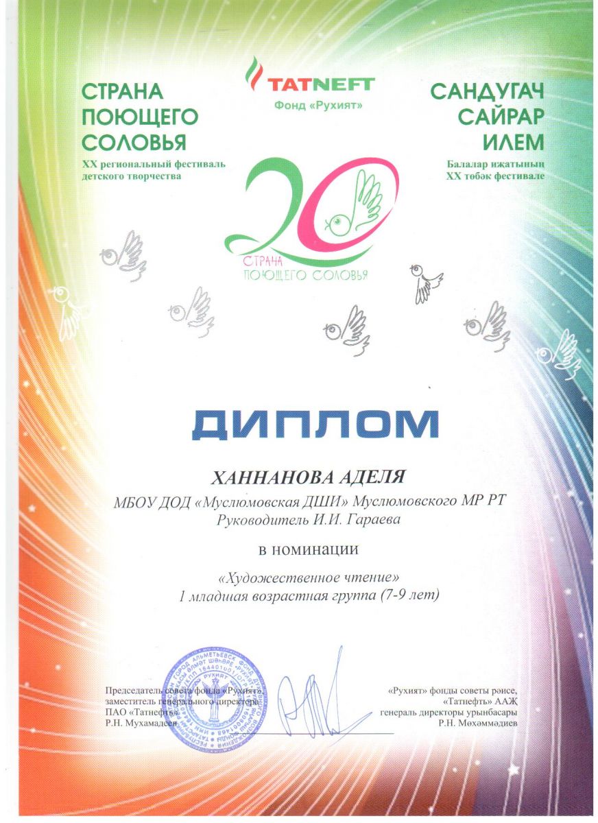 Аделя Ханнанова. Диплом XX регионального фестиваля детского творчества "Страна поющего соловья".