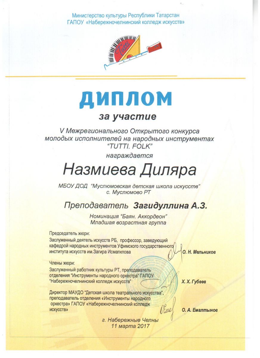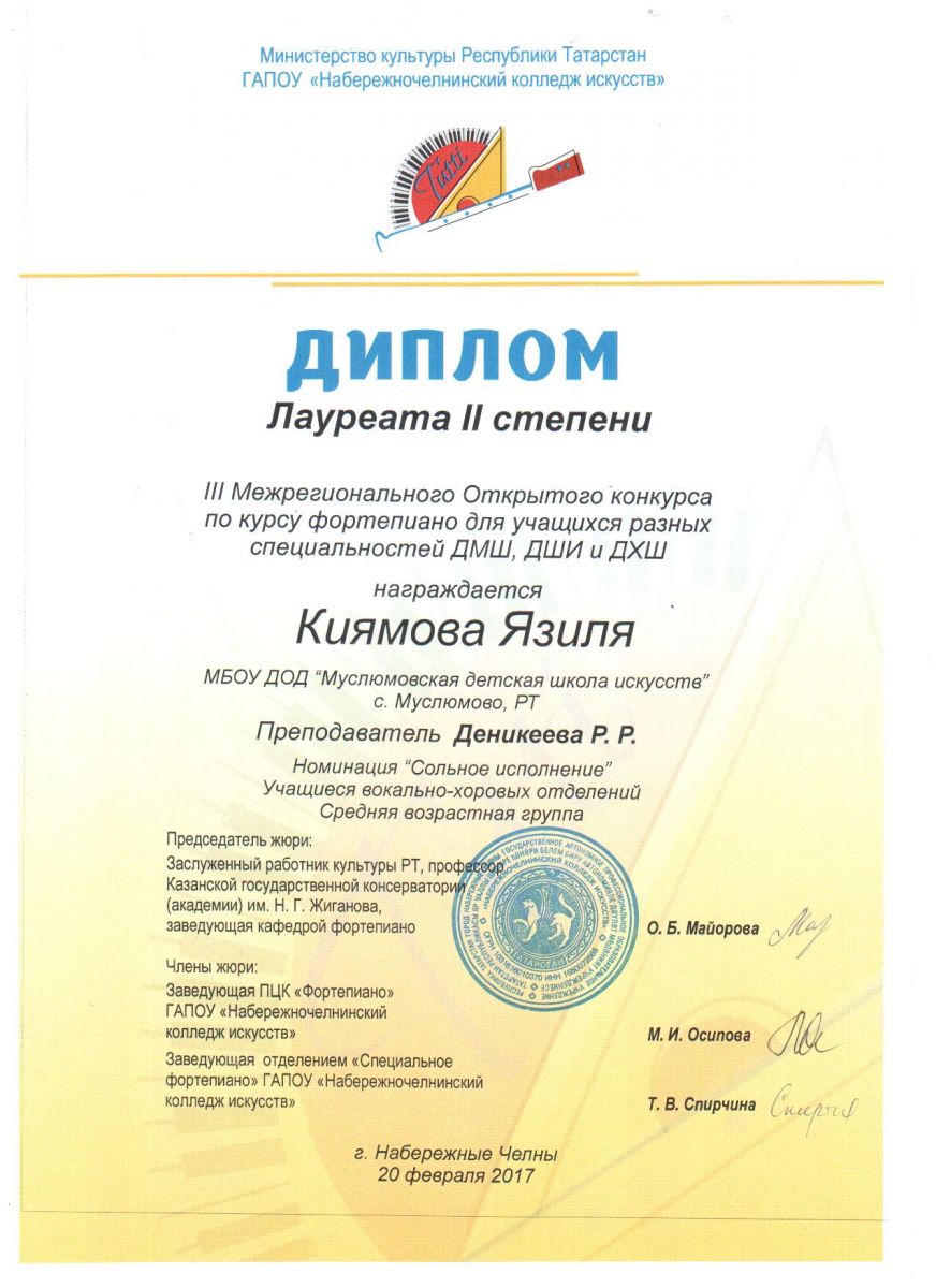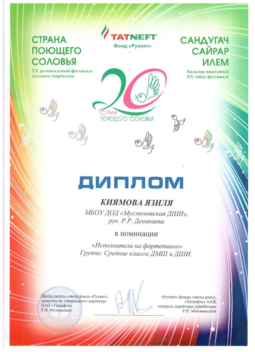 Киямова Язиля. Диплом XX регионального фестиваля детского творчества "Страна поющего соловья".
