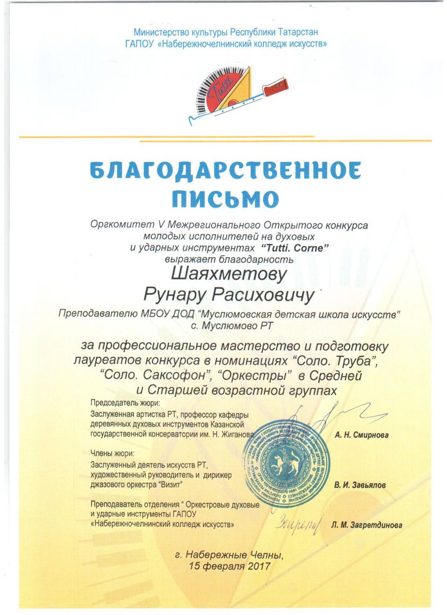Шаяхметов Рунар Расихович. Благодарственное письмо оргкомитета  III  Межрегионального Открытого конкурса молодых исполнителей на духовых и ударных инструментах "Tutti. Corne"
