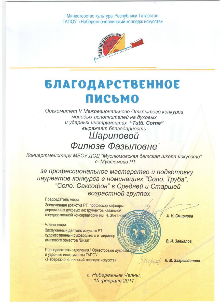 Шарипова Филюза Фазыловна. Благодарственное письмо оргкомитета  III  Межрегионального Открытого конкурса молодых исполнителей на духовых и ударных инструментах "Tutti. Corne"