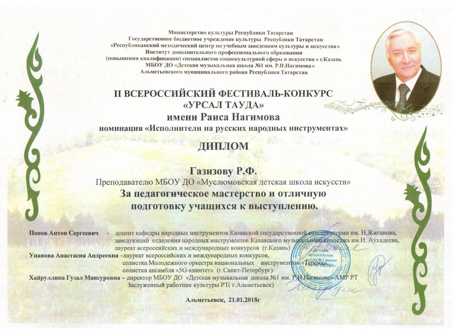 Радик Газизиов. Диплом II Всероссийского фестиваль-конкурса "Урсал тауда" имени Раиса Нагимова.