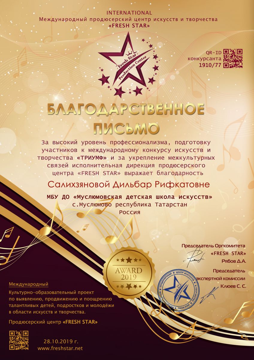 Салихзянова Дильбар Рифкатовна. Благодарственное письмо. Международный конкурс искусств и творчества "Триумф"