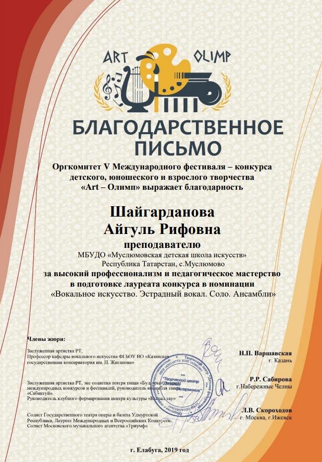 Благодарственное письмо Шайгардановой Айгуль Рифовне за высокий профессионализм и педагогическое мастерство в подготовке лауреата конкурса в номинации "  Вокальное искусство. Эстрадный вокал. Соло. Ансамбли."