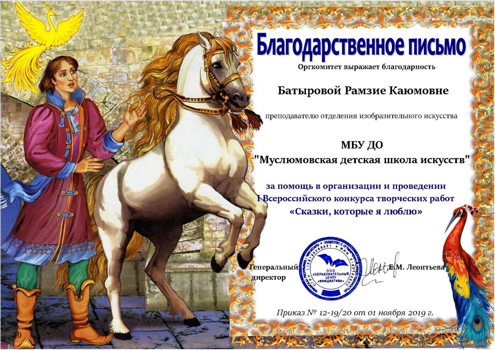 Благодарственное письмо Батыровой Рамзие Каюмовне за помощь в организации и проведении I Всероссийского конкурса творческих работ " Сказки, которые я люблю".