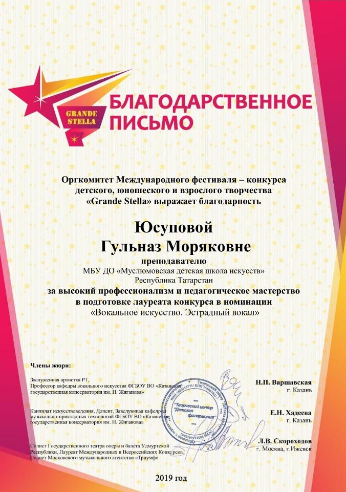 Благодарственное письмо Юсуповой Гульназ Моряковне за высокий профессионализм и педагогическое мастерство в подготовке лауреата конкурса в номинации "Вокальное искусство. Эстрадный вокал".Международный фестиваль-конкурс детского, юношеского и взрослого творчества "Grande Stella".