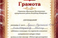 Группа учащихся начальных классов приняли участие на районном конкурсе чтецов произведений поэтов- земляков «Родного края разноцветье». Наибольшего успеха добилась ученица 2 класса Хисаметдинова Э., которая стала победительницей в номинации «За искренность исполнения», готовила ее к конкурсу учительница начальных классов Коткова М.Е.
