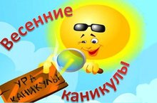 С завтрашнего дня начинаются весенние каникулы, которые будут продолжаться 10 дней с 20 марта по 29 марта. Выпускники должны это время использовать для подготовки к ГИА, а остальные учащиеся посвятить полезным и интересным делам: больше бывать на свежем воздухе, потому что на улице весна, посещать спортивные секции и кружки, которые будут работать в эти дни в школе, согласно плана мероприятий.