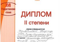 Кривошева Н., учащаяся 8 класса приняла участие на научно-практической конференции «Рождественские чтение», в г.Казани, где выступила с докладом «Александр Фролов, поэт-земляк» и была удостоена диплома 2 степени. Научный руководитель работы Новикова Н.Г., учительница русского языка.