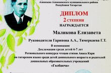 Азнакай муниөипаль районының "Айсылу" балалар бакчасында Әнәс Кари шигырьләрен яттан сөйләү буенча конкурста катнашып Маликова Елизавета II дәрәҗә дипломга ия булды.