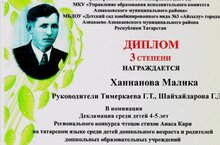 Азнакай муниципаль районының "Айсылу" балалар бакчасында уздырылган Әнәс Кари шигырьләрен яттан сөйләү буенча 4-5 яшьлекләр арасында Ханнанова Мәликә III дәрәҗә дипломга ия булды.