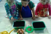 Младшая группа в уголке природы посадила лук, посеяла укроп. Они каждый день ухаживают за саженцами.