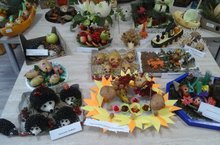 В детском саду прошел конкурс среди родителей "Осеннее изобилие". На выставке были представлены поделки из овощей, фруктов и природного материала.