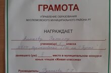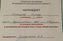 За успешное выступление в муниципальном конкурсе юных чтецов "Живая классика" награждается Шигапова Руфина, ученица 5 б класса, (учитель Галиуллина А.Я.)