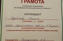 Мөслим лицее базасында узган "Живая классика" муниципаль яшь китап укучылар конкурсында уңышлы чыгыш ясаган өчен 5 б сыйныф укучысы Нургалиева Назилә (укытучы Галиуллина А. Я.) бүләкләнә.