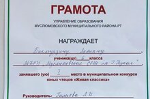 За успешное выступление в муниципальном конкурсе юных чтецов "Живая классика" награждается Шакирова Самира, ученица 5 б класса (учитель Галиуллина А.Я.)