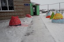 Родители пришли лепить фигуры.Они сделали из снега сказочных героев.