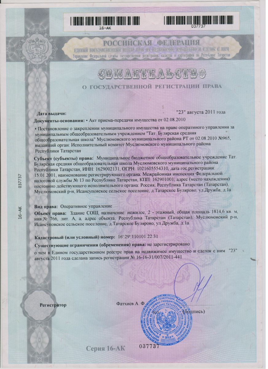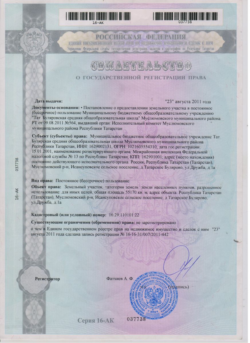| Адрес: | 423988, Республика Татарстан, Муслюмовский район, д. Татарское Булярово, ул. Дружбы, д. 1а. |