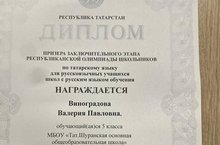 Учащиеся нашей школы - Виноградова Валерия (5 класс), Виноградов Роман (4 класс) стали призерами заключительного этапа Республиканской олимпиады школьников по татарскому языку.