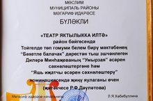 19 мая на базе Муслюмовской гимназии прошел финал муниципального конкурса школьных театральных коллективов "Театр ведет к свету". Всего в конкурсе, стартовавшем в сентябре, приняли участие театральные коллективы 17 школ района. В финале приняла участие и театральная группа "Балачак" Тойгильдинской ООШ, победившая в номинации "Постановка произведения юного творца".