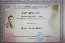 Наша ученица Хайретдинова А. была удостоена поездки в родное село Мусы Джалиля - Мустафино за активное участие в районном видеоконкурсе чтецов "Муса Джалиль - образец творчества и героизма". Посещение музея, мемориального комплекса, прослушивание интересных фактов из жизни великого писателя оставили неизгладимое впечатление.