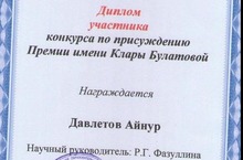 7 класс укуччысы Давлетов Айнур К.Булатова исемендәге конкурста катнашып диплом алды (укытучысы Фазуллина Р.Г.)