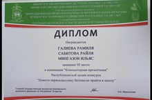 “Помоги первокласснику безопасно прийти в школу” кункурс-акциясендә компьютер презентациясе белән катнашып 11 класс укучысы Район Балалар Думасы депутаты Галиева Рәмилә җитәкчелегендәге укучылар командасы республика күләмендә 3 – урынны алды. Укытучы –кураторлары Шаяхметова Миләүшә Мөдәрис кызы белән укучылар Казанда бүләкләү тантанасында булып, Рөстәм Нургалиевич Миннеханов кул куйган диплом алып кайттылар.
