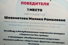 Поздравляем с большим успехом ученицу 7 класса Шаяхметову Малику и ее руководителя Шаяхметову Миляушу. Она заняла 1 место в республиканском конкурсе "Творчество без границ" в номинации изобразительного искусство.