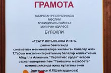 Сегодня на базе Муслюмовской гимназии прошел финал муниципального конкурса "Театр яктылыкка илтә". Подведены итоги конкурса, который начался в сентябре.Всего в конкурсе приняли участие 18 школ. Театральный коллектив нашей школы участвовал в этом конкурсе под руководством библиотекаря Халимовой Гузель Мирзамуратовны и учителя татарского языка Шайгардановой Илсои Ринатовны со сказкой Абдуллы Алиша "Сертотмас үрдәк". Ученик 9 класса Львов Сергей одержал победу в номинации "Лучший исполнитель своей роли", коллектив-в номинации "Зрительские симпатии". Они были награждены дипломами и памятными подарками управления образования.