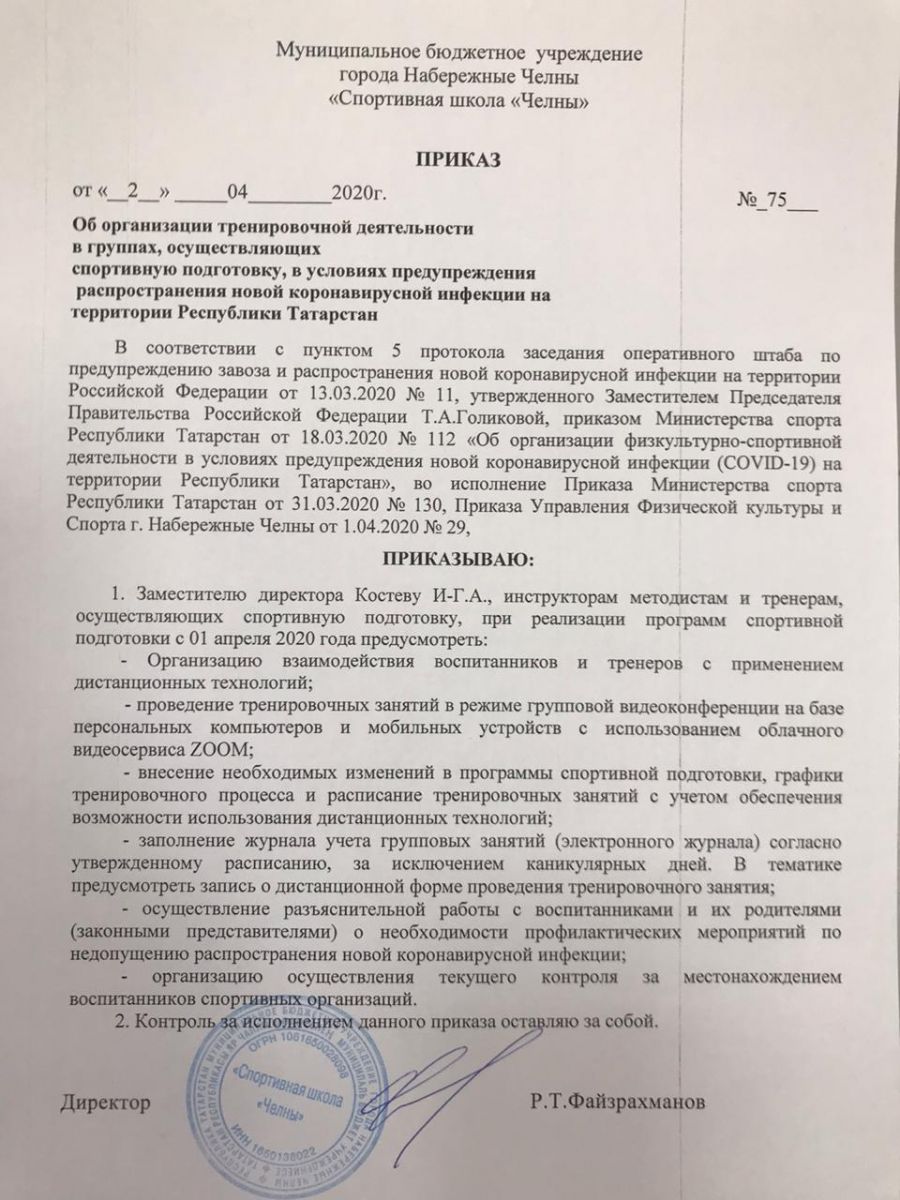 Приказ МБУ «СШ «Челны» №75 от 02.04.2020 г.