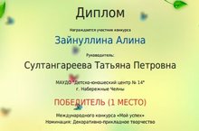 От всей души поздравляем Зайнуллину Алину - учащуюся объединения "Мастерилка" (педагог Султангареева Т.П.) с победой в Международном конкурсе "Мой успех" в номинации «Декоративно-прикладное творчество»!