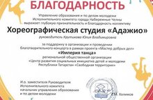 9 апреля 2015 года хореографическая студия «Адажио» приняла участие в благотворительном концерте в рамках проекта «Мастер добрых дел» «Империя танца», организатором которого стал РОО «Центр развития социальных инициатив детей и молодежи РТ «Свободная территория».