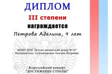 Петрова Аделина - воспитанница творческого объединения "Мастерилка" заняла III место во Всероссийском конкурсе с очень значимым названием "Достижение страны" - поздравляем!