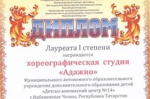 29 марта 2014 года в г. Елабуга прошел республиканский конкурс «Алло мы ищем таланты». Хореографическая студия «Адажио» приняла не только активное участие, но и стала лауреатами этого конкурса (Группа «Вегас» - лауреат 1 степени, Зимушка и Только вперед – лауреат 2 степени), по результатам которого воспитанники студии могут поступить в Елабужский колледж культуры ...