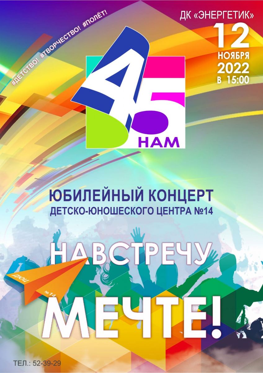 Детско-юношескому центру - 45! В минувшие выходные состоялся юбилейный концерт «Навстречу мечте!», посвященный этой замечательной дате. Мы рады были видеть друзей, коллег и ветеранов нашего Центра. Концертные номера, сценография, стилистика, световое и звуковое оформление получили восторженные отзывы зрителей, мероприятие прошло на едином дыхании. Нас пришли поздравить представители Управления образования, городской профсоюзной организации, директора организаций дополнительного образования и школ города. В мероприятии приняли участие творческие коллективы нашего Центра, спортивные объединения, педагоги декоративно-прикладного и технического творчества, участники городских программ. Выражаем слова признательности всем педагогам, обучающимся и родителям за подготовку и организацию юбилейного концерта. Мы движемся навстречу Мечте, наш полет продолжается! Всех с праздником!С уважением, Администрация Центра!