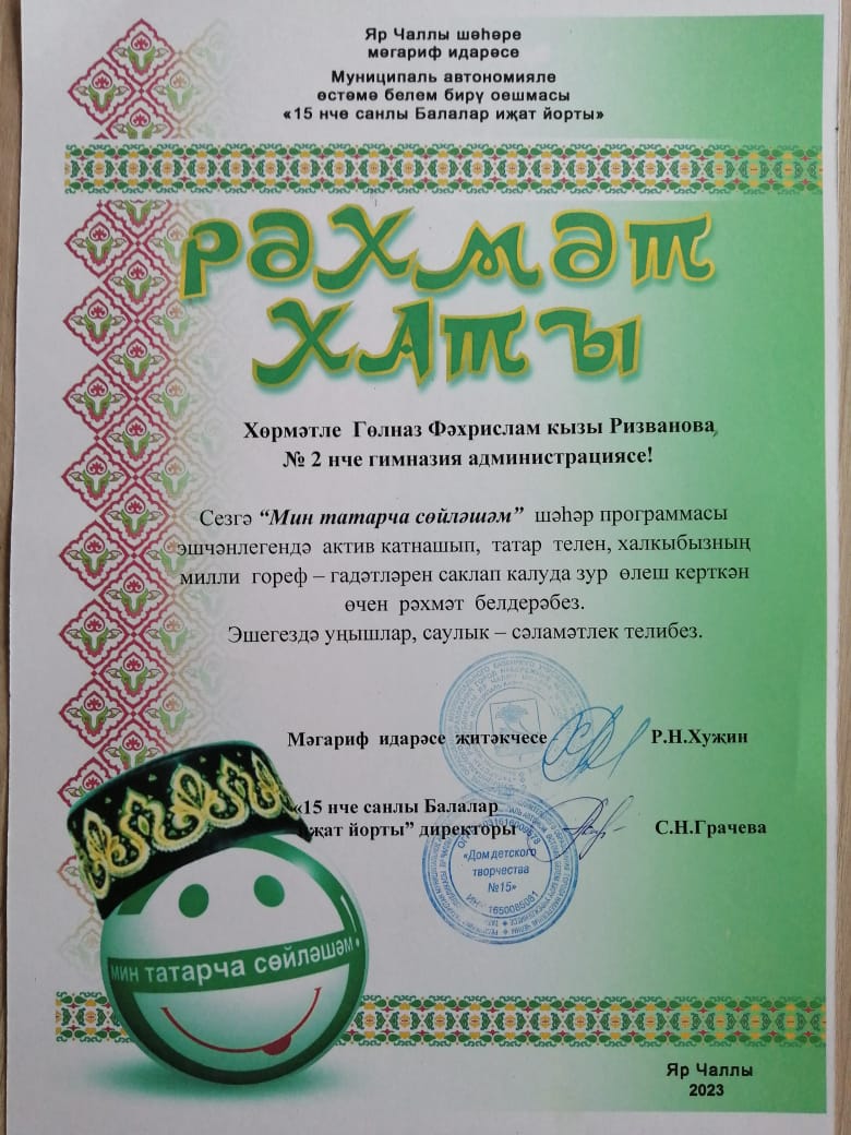 Укытучылар һәм остазлар елы уңаненнан бик күп чаралар уздырыла. Бүген шушы уңайдан шәһәребезнең 1-нче санлы балалар һәм яшүсмерләр иҗат йортында 5-8 нче сыйныфта укучы малайлар арасында “Татар малае – 2023” бәйгесе булып узды. Гимназиябез данын яклап 7в сыйныфы укучысы Гайнетдинов Айзат Алмаз улы чыгыш ясады һәм лаеклы 2 нче урынны яулады. Ана телендә матур итеп сөйләп чыгыш ясаучы Айзатка, үз теленең аһәңле яңгырашын тоярга бер яктан гаиләсе ярдәм итсә, икенче яктан гимназиябезнең фидакарь мөгаллимнәре зур тырышлык куя. Айзатны ана теленнән белем дәрьясында гиздерүче, тәрбия әшләре буенча директор урынбасары – Нурисламова Энҗе Әзһәм кызының һәм сыйныф җитәкчесе Ризванова Гөлшат Рәзиф кызының әти – әниләр, укучылар белән уртак тел табып эшли алуы – иҗади югарылыкка күтәрүдә зур этәргеч дип әйтергә кирәк. Айзатның төрле нәфис сүз бәйгеләрендә катнашып призлы урыннар яулавы һәм бүгенге җиңүе - әнә шуларның ачык мисалы. Айзатны зур җиңүе белән котлыйбыз. Улларын акыллы, зирәк итеп тәрбияләүче гаилә башлыгы – Гайнетдинов Алмаз Таһир улына, гаилә учагын саклаучы әнисе - Гайнетдинова Эльза Салихҗан кызына, озак еллар укытучы булып эшләгән әбисе - Хөсәенова Гүзәлия Ибраһим кызына рәхмәт сүзләре җиткерәбез. Ә Айзатка исә, киләчәктә тагын да зуррак уңышларга ирешүен теләп калабыз.