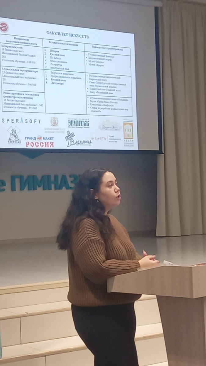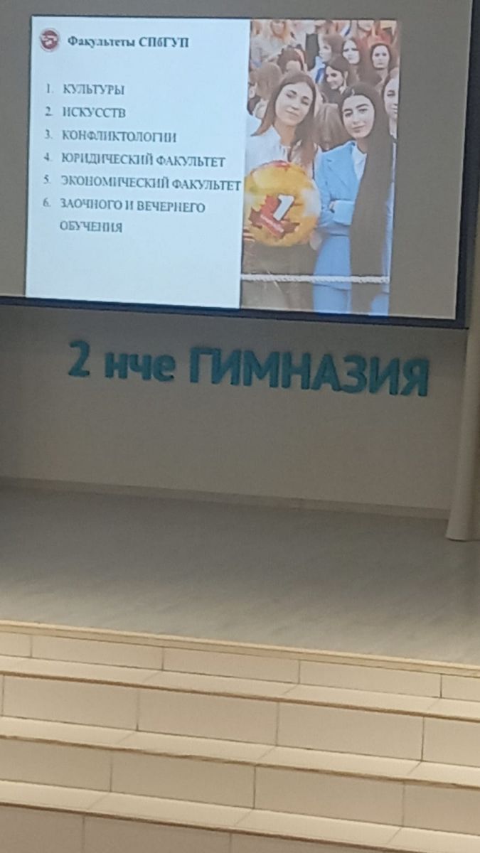 Гимназия укучылары югары белем бирүче уку йортлары белән танышуларын дәвам итәләр. Чиратта - Санкт-Петербургның профсоюзлар гуманитар университеты. Әлеге уку йорты белән таныштыру максатыннан, университетның кабул итү комиссиясе җитәкчесе Уткина Анастасия Сергеевна үзе үк укучылар белән очрашуга килде. Уку йортына керү, яшәү шартлары, студентларның мөмкинлекләре хакында яхшылап аңлатты. Шунысы куанычлы: әлеге уку йортына керергә теләүче укучылар бездә бар, димәк, кирәкле сүз кирәкле вакытта әйтелде.
