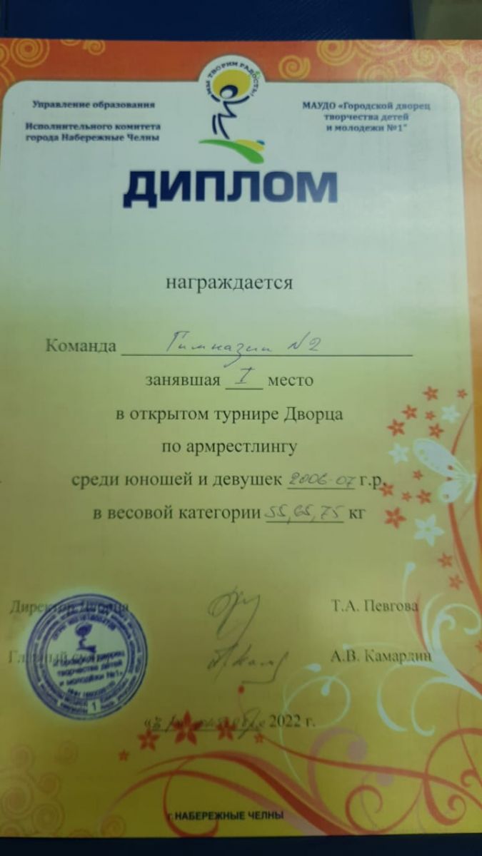 Физкультура укытучысы Хәбибуллин Илнур Рафаэл улы гимназия укучыларын армрестлинг спорт төре белән кызыксындырып кына калмады, ә инде берничә ел рәттән шәһәр турнирында жиңүчеләр тәрбияләде. Гибадуллин Адель, Муллаяров Нияз, Гайнуллин Адель, Нуруллин Газиз, Хәсәнова Ләйлә быел да әлеге спорт төре буенча шәhәр турнирында жиңүчеләр булдылар. Афәрин, сез булдырасыз!
