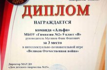 ПОЗДРАВЛЯЕМ команду учащихся 9 класса "АЛЬФА", занявшую III место в интеллектуально - познавателной игре "Великая Отечественная война"! Объявляется благодарность руководителю Мугинову Фаику Фоатовичу за подготовку команды к игре.
