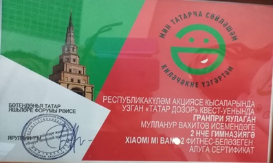 Республикакүләм акциясе кысаларында узган "ТАТАР ДОЗОР" квест - уенында безнең гимназия укучылары һәм аларның җитәкчеләре Фатыйхова Нәзлия Гаян кызы ГРАН- ПРИ яулады. Чараның максаты - социаль - актив яшьләрдә милли мәдәниятне һәм туган телне саклауда җаваплылык хисе тәрбияләү иде. Укучыларга киләчәктә дә уңышлар теләп калалбыз.