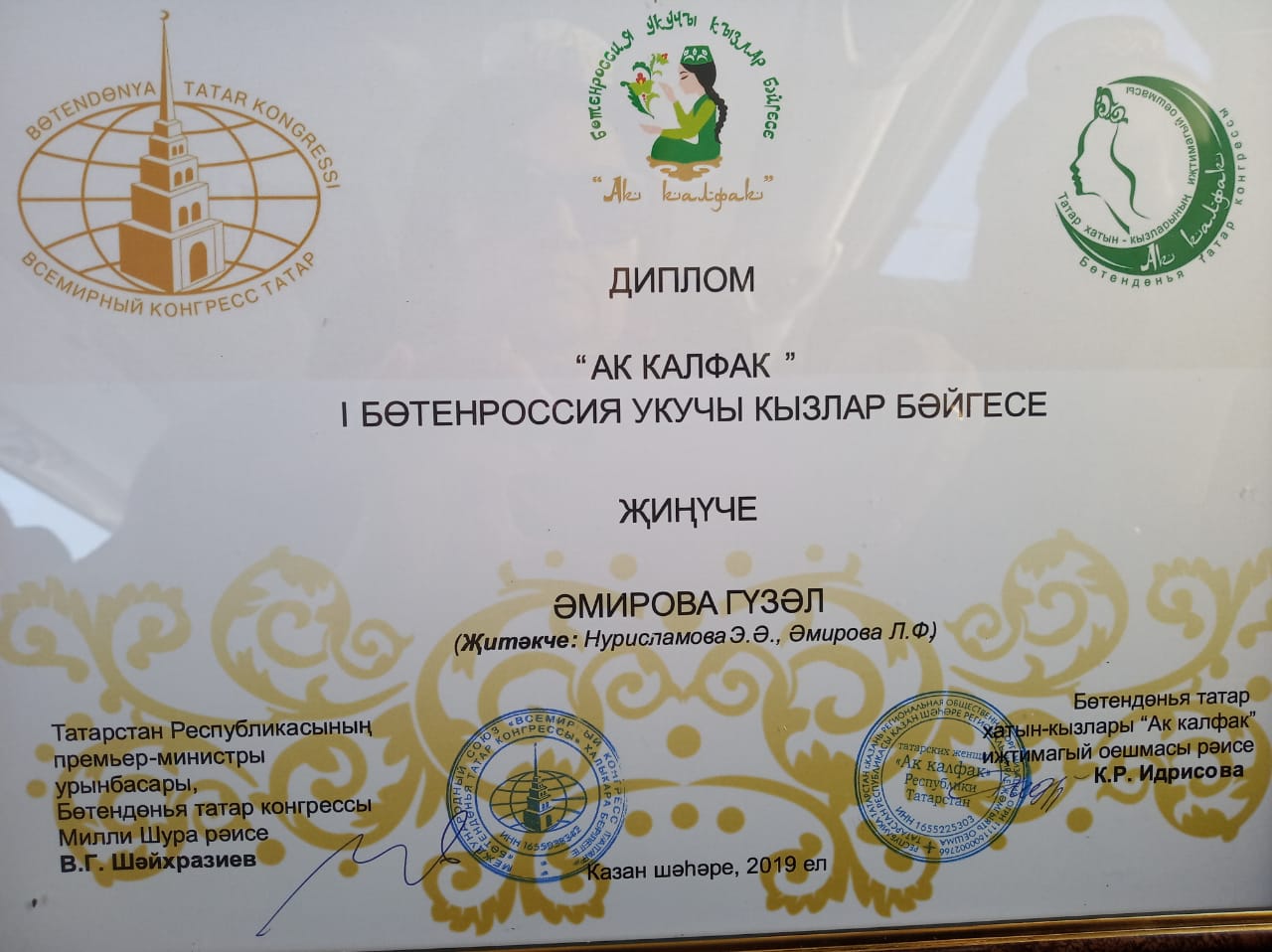 "АК КАЛФАК" Бөтенроссия укучы кызлар бәйгесендә җиңүче булган 10 сыйныф укучысы ӘМИРОВА ГҮЗӘЛНЕ һәм җитәкчесе Нурисламова Энҗе Әзһәм кызын чын күңелдән котлыйбыз! Яңадан - яңа уңышлар телибез!