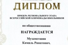 обществознанию ученика 10 класса МУХАМЕТШИНА КАМИЛЯ! Объявляется благодарность учителю обществознания ГАБДУЛВАЛИЕВОЙ ГУЗЕЛИЕ РАФАКОВНЕ за подготовку учащегося к олимпиаде. Молодцы!