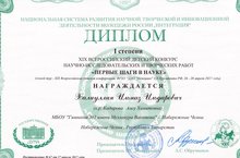 Ученик 2 класса Халиуллин Ильназ занял I место в ХIX Всероссийском детском конкурсе научно - исследовательских и творческих работ "ПЕРВЫЕ ШАГИ В НАУКЕ", который прошел в г.Москва. Научный руководитель участника - учитель начальных классов Кадирова Алсу Хамитовна. МОЛОДЦЫ! Желаем дальнейших успехов!