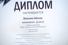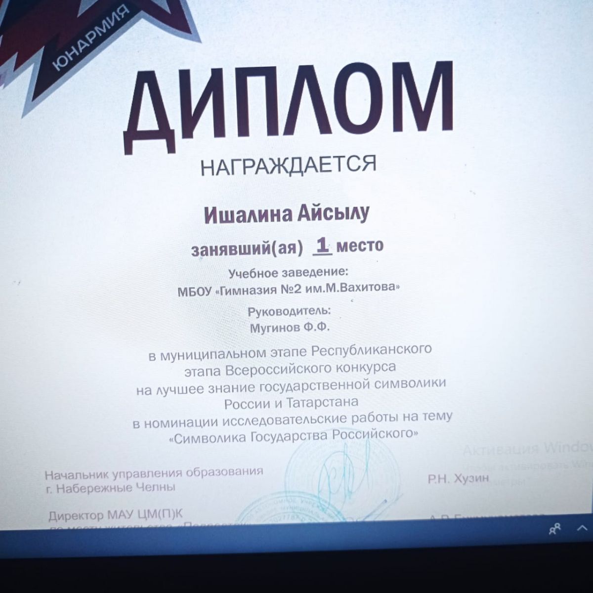 Гимназиянең 11 сыйныф укучысы Ишалина Айсылу Рәсәй hәм Татарстан дәүләт символикаларына багышланган рәсәйкүләм бәйгенең муниципаль этап жиңүчесе булды(укытучысы Мугинов Фаик Фоат улы) , котлыйбыз! Афәрин!
