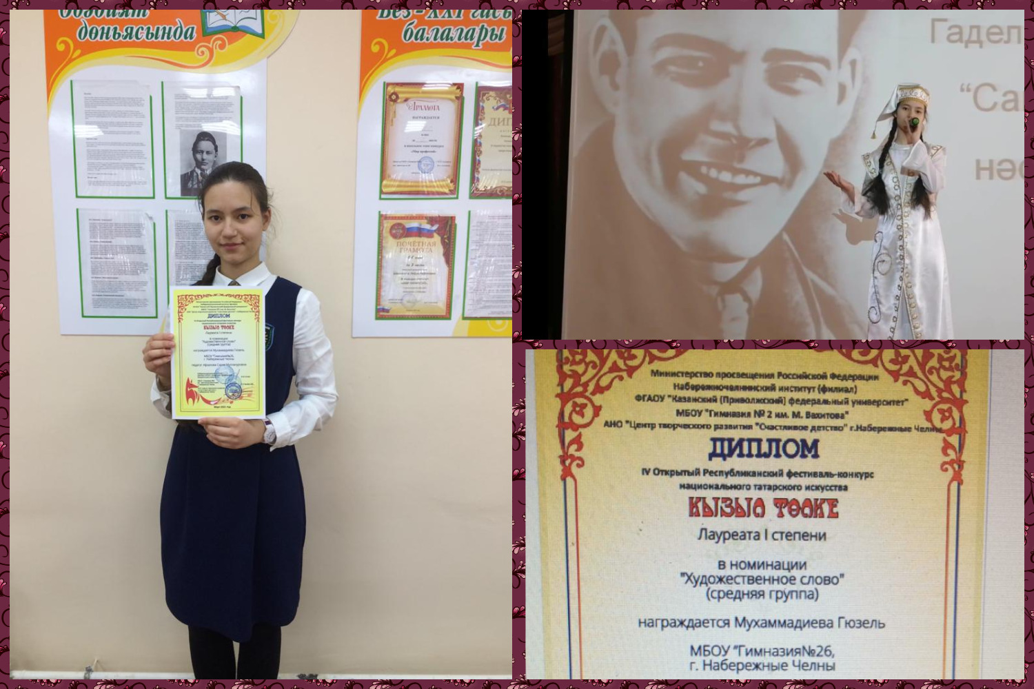 Мухамадиева Гузельлауреат I степени в номинации "Художественное слово"IV открытого Республиканского фестиваля-конкурсанационального татарского искусстваКЫЗЫЛ ТӨЛКЕ -