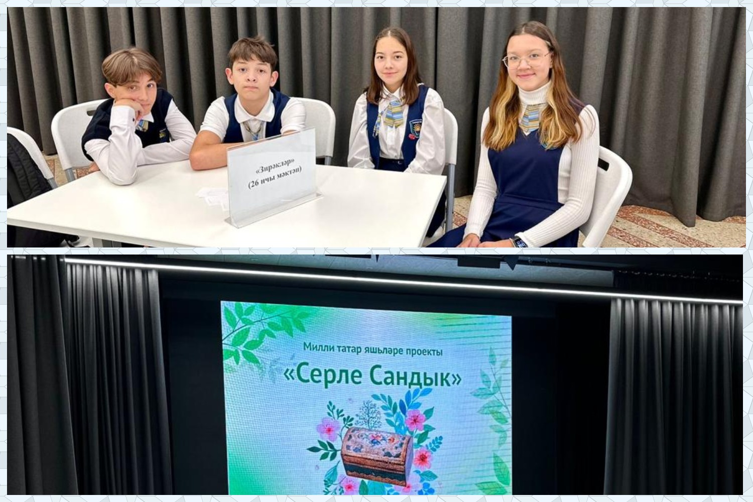 8 нче д сыйныфы укучылары- Закирова Амелия, Секретарьев Илья, Сатдаров Данияр, Хуснеева Ясмина «Серле сандык» конкурсында. Җитәкчесе: СабироваФ.В./ Учащиеся 8 д класса — Закирова Амелия, Секретарьев Илья, Сатдаров Данияр, Хуснеева Ясмина на конкурсе «Серле сандык».Руководитель: Сабирова Ф.В.
