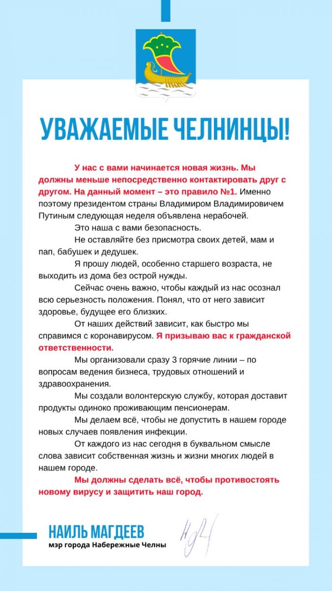 Обращение мэра города Набережные Челны Магдеева Н.Г. к жителям